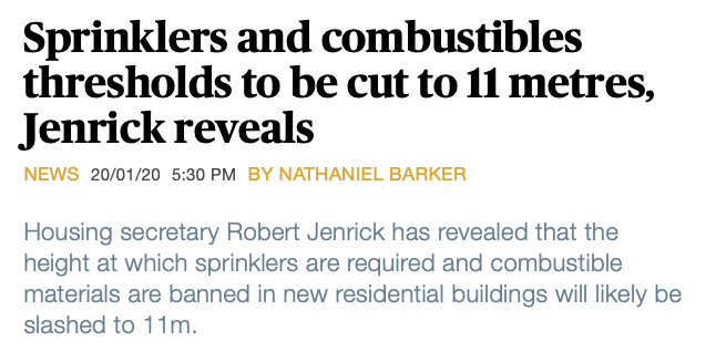 Inside Housing covered the announcements, which include reducing the height threshold for the ban of combustible materials and requirement of sprinklers, from 18 metres down to 11 metres.