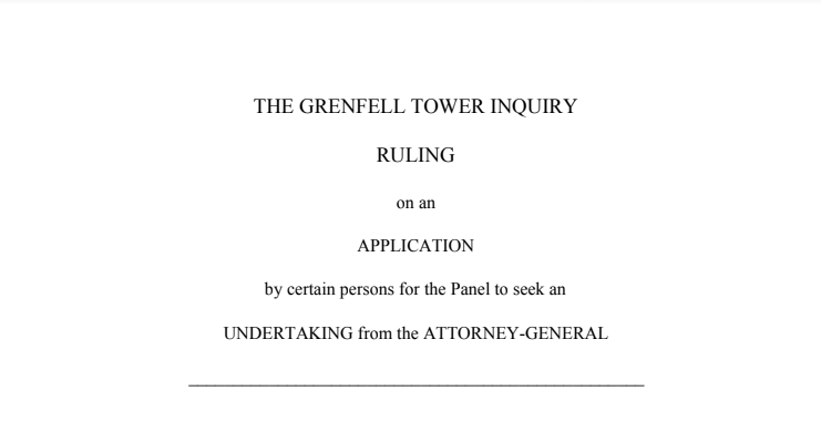 Grenfell Tower Inquiry rulingtowerblocksukFeb 7, 20201 min readThe Grenfell Tower Inquiry: Ruling on an Application by certain persons for the panel to seek an Undertaking from the Attorney-General Read more below